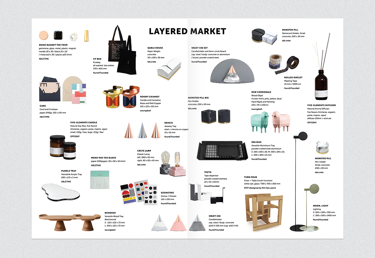'Layered Market' is an exhibition collaboration project for 6 brands - found/Founded, swungdash, lab.crete, Abletime, Rixt, Offgray. Separated or together - ”Layered Market” represents individual characteristics but still harmonious. We suggest new possibility of our brands and expansion of each brand through 'layered market.'